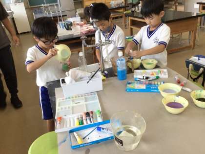 1年生が図工の授業で、色水を作りました。子どもたちは、「きれいな色を作りたい!」という思いのもと、いろいろな色の絵の具を混ぜたり水で薄めたりしました。「見て!きれい!」「お気に入りの色ができた!」などと友達にうれしそうに伝えながら、色水の変化を楽しみました。