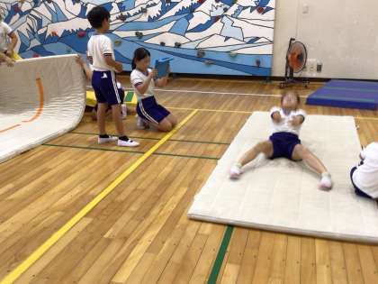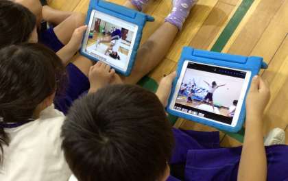 3・4年生が体育の授業で開脚前転と開脚後転を練習しました。子どもたちは、学習用タブレットで撮影した自分の技をスロー再生で視聴し、何を改善すればスムーズに回転できるかを自分で考え、何度も試していました。
