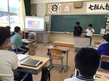 10/2「おすすめの国を紹介しよう 〜6年生〜」 公開日 2023/10/02 更新日 2023/10/02 お知らせ 6年生が外国語の授業で、ペアで調べた世界の国について、英語で紹介をしました。子どもたちの紹介では、ジェスチャーを交えたりクイズ形式にしたりと聞き手を楽しませる工夫が随所に見られました。
