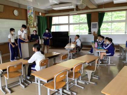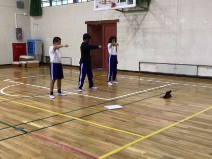 5時間目に4〜6年生が紅組と白組に分かれて、運動会での応援合戦の練習を行いました。6年生が応援の仕方の見本を示し、4・5年生がそれを真似しながら歌やダンスを覚えていきました。元気のよい掛け声や踊りから、応援合戦の勝負にかける意気込みが伝わってきました。