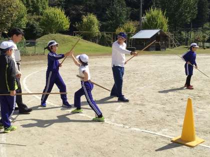 10/13「第2回棒の手講習会 〜全校〜」 公開日 2023/10/13 更新日 2023/10/13 お知らせ 2時間目に、本年度2回目の棒の手講習会を行いました。前半は、押井の見当流、杉本の藤牧検藤流、大坪の起倒流の順で演武を互いに見合い、よいところを伝え合いました。後半は、各流派に分かれ、講師の方々に丁寧に指導していただきました。講師の方から「間合いの取り方は大人でも難しいが、とてもうまくなった!」と励みになる言葉がかけられ、子どもたちは自信をつけることができました。