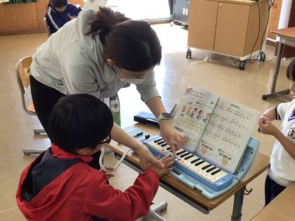 1・2年生が2時間目の音楽の授業で、「山のポルカ」を鍵盤ハーモニカで弾けるように練習しています。「ソソミ〜ララソ〜ソソファミファ〜♪」、タンギングと息の強さに気を付けると、楽しい感じで演奏できることがわかりました。