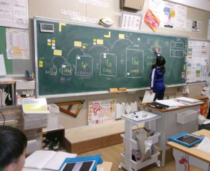 4年生が、算数の授業で面積の求め方について学習しました。子どもたちは、特殊な形をした四角形の面積について学級で発表し合い、「そういう解き方もできるんだね」などと、様々な求め方があることに気づくことができました。