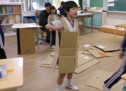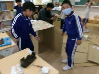 1年生が図工の授業で、箱を組み合わせて好きなもの作っています。今回は、段ボールを組み合わせたり切ったりしながら、楽しく活動に取り組んでいました。
