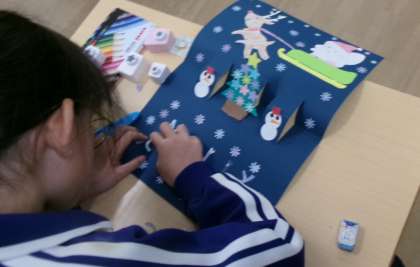 3年生が、図工の授業でクリスマスカードを作っています。カードをプレゼントする相手は、家族、友達、お世話になった人など、子どもたちが決めます。子どもたちは、細かい部分にも気を配り、集中して作っていました。