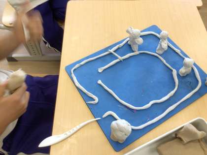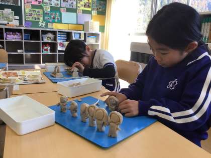 1/17(水)「思い出を形に」 公開日 2024/01/17 更新日 2024/01/17 お知らせ 2年生が図画工作科の学習で、楽しかったことやがんばったことを粘土で表現しました。「マラソン大会でトラックを走っているところ」や「生活科の時間に二十日大根を抜いて写真撮影をしているところ」など、体験の中で心に残っていることを楽しく立体に表しました。