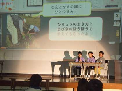 今日は、保護者の方をお招きして、学習発表会を開催しました。会は、全校合唱「君をのせて」からスタートし、1年生から順番に学習成果を発表しました。