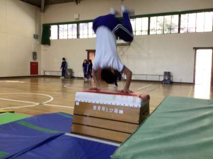 5・6年生が体育の授業で跳び箱に取り組み、開脚跳び、台上前転、閉脚跳びなどを練習しています。さらに発展技として、「前方屈腕倒立跳び」に挑戦する児童もいます。一人一人が目標をもち、何度も挑戦し、できる技が増えています。