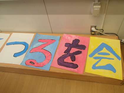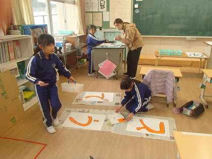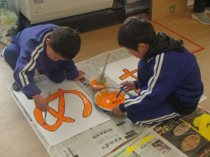 2年生が、「6年生を送る会」の会場に掲げる看板を作っています。何とか本番に間に合させようと、子どもたちは頑張って色を塗っています!