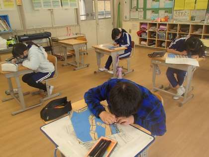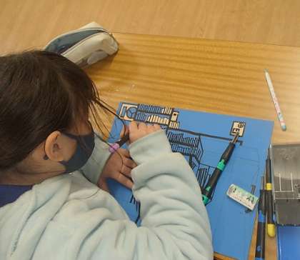 5年生が図工の授業で、木版画に取り組みました。図書館や校庭の丸池などを、遠近感や立体感が出るように意識しながら彫っていました。彫り間違いができない緊張感の中、子どもたちは集中して黙々と取り組んでいました。