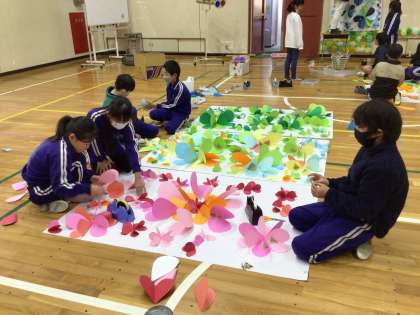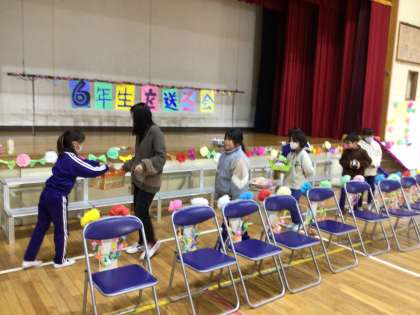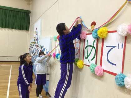 朝の活動で、5時間目「6年生を送る会」に向けて、準備会を行いました。1年生は卒業生のいす、2年生は「送る会」の題字、3年生は前面舞台、4年生は北側壁面、5年生は背面と南側壁面を、心をこめて飾りました。「6年生に喜んでほしい」という下級生の気持ちがあふれています。