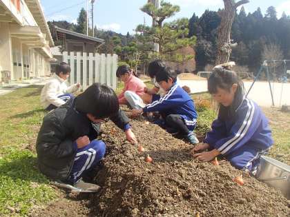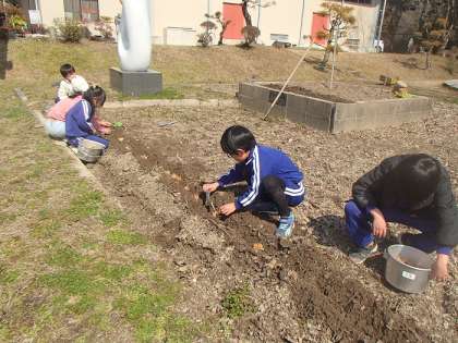 1年生が、生活科の授業でチューリップの球根の植え付けを行いました。子どもたちは、全部で100個以上の球根を友達と手分けして植えました。4月にたくさんのチューリップが咲き誇るのが楽しみです!