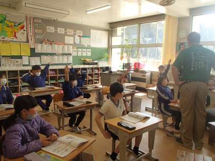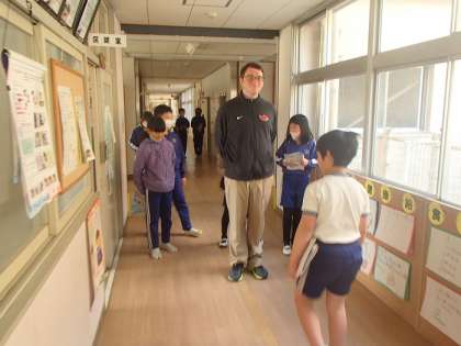 4年生が外国語活動の授業で、学校のお気に入りの場所に、ALTを英語で案内する活動を行いました。子どもたちは「let’s go straight!」「turn left」とALTに伝えながら実際の場所まで案内し、「My favorite place is nurse ’s office!」などと紹介しました。無事に案内でき、子どもたちはとても喜んでいました!