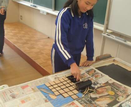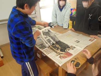 5年生が図工の授業で木版画を制作しています。今日は、いよいよ印刷する工程に入りました。子どもたちは、印刷して出来上がった自分の作品を見て、「おお〜!」と思わず感動の声を上げていました。