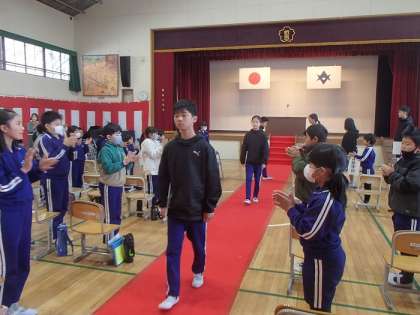 今日、全校児童が卒業式の予行練習を行いました。入場から退場までひと通りの流れを確認しました。練習を重ねる度、式に対する子どもたちの意識が高まっていき、全校の一体感を感じる予行練習となりました。
