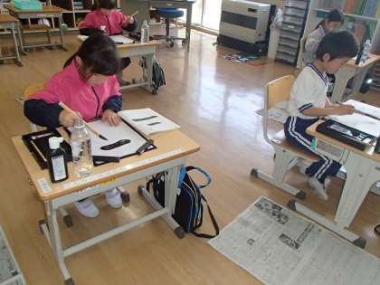 3年生から毛筆の学習が始まります。今日で2回目の学習となった子どもたちは、「二」という字を、「トン、スーッ、トン」をイメージして練習しました。子どもたちは、少し緊張しながらも、「いい字を書きたい!」という思いで丁寧に書き上げていました。