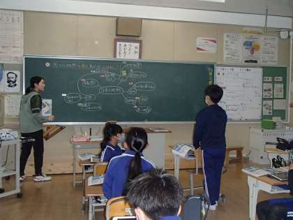 4/23「国土の特色は?」 公開日 2024/04/23 更新日 2024/04/23 お知らせ 5年生が社会の授業で、日本の国土の地形の特色について調べました。「山が多い」「平地に家が集まっている」「火山がある」など、地図や写真からたくさんの特色を読み取り、積極的に発言していました。