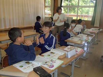 3・4年生が音楽の授業で、歌「茶摘み」のリズムに合わせてペアの子と手遊びを楽しみました。「なつも ち〜かづく〜」と歌いながら、互いのタイミングを合わせて手を叩くことが難しそうでしたが、だんだんと慣れていき、上手にできるようになりました。