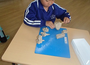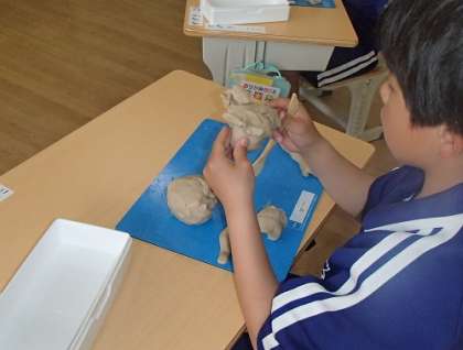 1年生が図工の授業で、ねんどで好きなものを作りました。つくったものは「ドラゴン」「ラッコ」「急須」などバラエティー豊かで、子どもたちは試行錯誤しながら作品作りを楽しんでいました。次回の図工では、ねんどで好きな「ごちそう」を作ります!