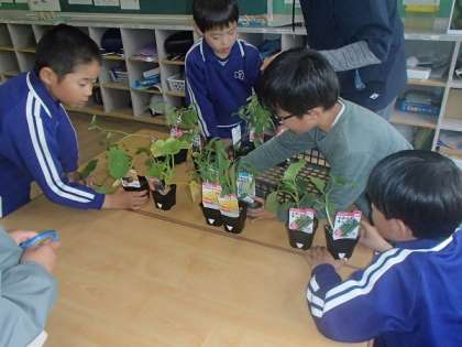 2年生が生活科で育てる野菜の苗が教室に届きました。子どもたち一人一人が希望した野菜の苗なだけに、本物の苗を見た子どもたちはとても喜んで水やりをしていました。また、家にある野菜や果物の種も持ってきて学校で育てることにもなり、さらにわくわくが膨らみました。