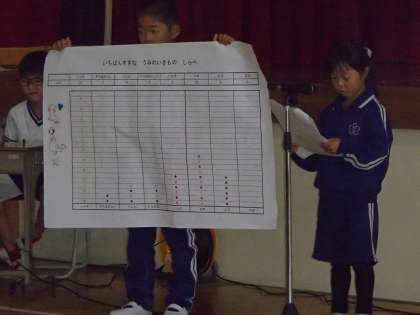朝の活動に、全校集会を行いました。今回は、2年生が算数の学習を生かし、全校児童対象にアンケートを行った結果を表にまとめて発表しました。「好きなお菓子」や「人気の海の生き物」などのアンケート結果を、クイズ形式で予想しておいてから結果発表したことで、子どもたちは興味・関心を高めて結果を楽しんでいました。2年生は、各自の役割分担をきっちりやり遂げ、成長が伝わってきました。