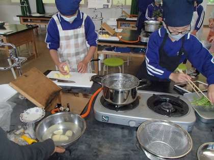 5年生が家庭科の授業で、野菜のゆで方を学びました。調理実習を通して、じゃがいもと青菜の切り方やゆで方の違いを知りました。最後は、「ゆでいも」と「青菜のおひたし」をおいしくいただき、ご満悦の様子でした!