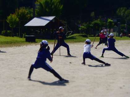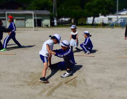 朝の活動の時間に、全校で棒の手を練習しました。先日、5・6年生が体育の授業で、地域講師の方から基本的な動きを教えていただきました。今日は、その時学んだことを、5・6年生が下級生に1対1で丁寧に教えていました。膝を曲げて腰を深く落とすことで、見栄えがぐっとよくなりました。