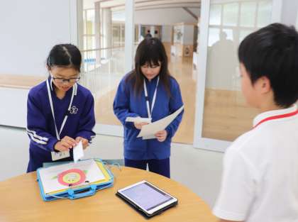 6年生が、来年度入学予定の旭中学校に出向き、中学1年生の生徒たちの案内による中学校探検を楽しみました。中学生は、「Turn left!(左に曲がって)」「Go up!(階段を上がって)」などと英語で校舎を案内してくれました。案内された各ポイントでは、中学生が英語で質問し、それを英語で答えるとシールをもらえるスタンプラリーが行われました。子どもたちは、楽しい時間を過ごしながら、中学校の雰囲気を感じることができました。