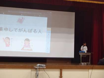 3年生が全校朝会で、国語で「わたしの説明文を書こう」で書いた文を発表しました。自分はどんな人か、どんなところを伸ばしていきたいか、などを、スライドを使って発表しました。3年生は緊張気味でしたが、しっかりと最後まで伝え切り、大きな拍手をもらっていました。
