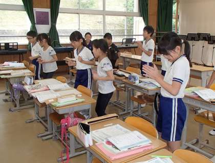3・4年生が音楽の授業で、「いろいろなリズムを感じ取ろう」をめあてにリズム遊びをしました。子どもたちは、曲のリズムに合わせて、手やひざ、おなかなど体のいろいろな部分を叩き、音の違いを楽しみながら表現を工夫していました。