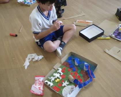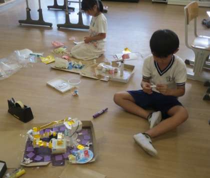 2年生が、図工の授業で「わくわくおはなしゲーム」というすごろくボードゲームを作っています。すごろく用のコマとして、おはなしに登場するキャラクターを紙粘土で作りました。子どもたちは、作品に愛着をもって丁寧に作っていました。