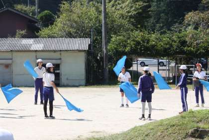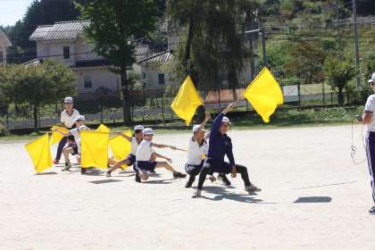 運動会で行われる赤白対抗応援合戦に向け、高学年が意欲的に準備を進めています。今年度の応援合戦は、青色と黄色の旗を動かして一体感ある動きを競うフラッグダンスに初挑戦します。旗の振り付けは、全て6年生が考えました。今日は、6年生がサブリーダー役となる5年生に振り付けを丁寧に教えていました。息の合った迫力ある演技をめざし、高学年はやる気いっぱいです!