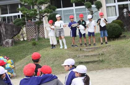 10/24「全校遊び」 公開日 2024/10/24 更新日 2024/10/24 お知らせ 今回の全校遊びは、2年生が企画・進行して行いました。はじめに縦割り班で山手線ゲームを楽しんだ後、「全校転がしドッジボール」で盛り上がりました。会の最後には、2年生が育てたトウモロコシの種と手作り折り紙が一人一人にプレゼントされました。2年生が、この日のためにいっぱい準備してきてくれたことが伝わる会でした。