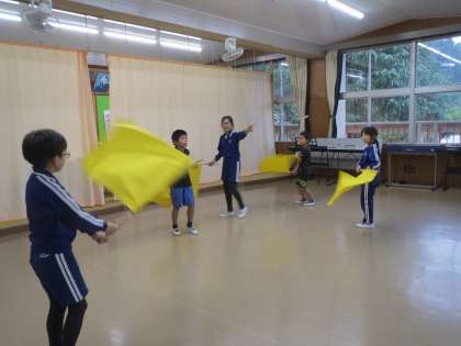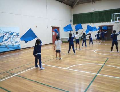 11月9日の運動会に向けて、赤組、白組が6年生の応援団長を中心に応援合戦の練習に励んでいます。各組とも応援合戦での勝利をめざして、一生懸命にフラッグの動きを覚えています。