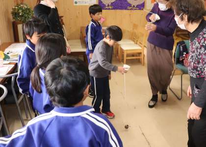 1年生が、手作りの秋のおもちゃを持って「しきしまの家」に出向き、地域の方々とおもちゃ遊びを楽しみました。どんぐりごま、松ぼっくりのけん玉などのおもちゃ遊びを通して、地域の方々との親睦を深めることができました。