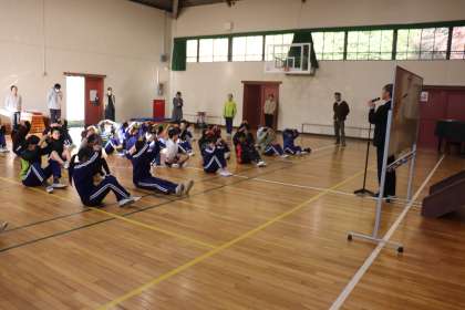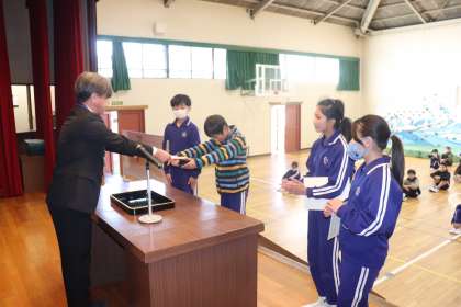 朝の活動の時間に、全校集会を行いました。始めに「社会を明るくする運動」作文コンテストや豊田市科学研究作品展、旭木の駅プロジェクト実行委員会・あさひ根っこの会共催の作品募集の表彰を行いました。