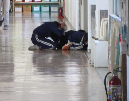 今日の昼の掃除の時間中に、予告なしで地震からの避難訓練を行いました。子どもたちは、教室や図書室、運動場など各掃除場所から、安全に避難する方法を自分たちで考えて運動場に避難しました。抜き打ちの訓練に驚いた子もいましたが、全員が真剣に訓練に取り組むことができました。