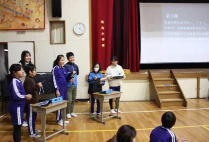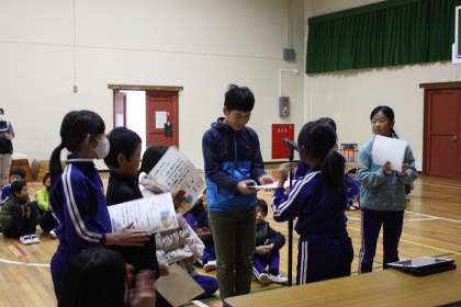 12/17「本ラブ集会」 公開日 2024/12/17 更新日 2024/12/17 お知らせ 昼の休み時間に、図書委員会主催の「本ラブ集会」が開催されました。前半に、図書委員が夢空館(図書室)にある本にまつわるクイズを出題し、なかよし班で正解数を競って盛り上がりました。後半は、図書委員から、「読書すごろく」にゴールできた人に賞状と手作りシールが贈られました。 図書委員の楽しい企画のおかげで、全校の仲間と楽しい昼休みを過ごすことができました。