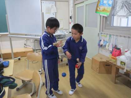 3年生が、1・2年生の教室に出向き、得意のけん玉を1・2年生に教えてあげました。この日に向けて、3年生はけん玉の腕を磨くために自主的に練習してきました。1・2年生は、3年生に優しく教えられ、けん玉に熱中していました。