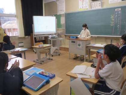4年生が国語の授業で、全校アンケート調査を行った結果を報告し合いました。子どもたちは、「動物」「寿司」「給食」など各自でジャンルを決め、それぞれのジャンルで好きなものとその理由について、学習用タブレットを使って全校児童にアンケート調査しました。仲間が調べた内容に、子どもたちは興味津々で聞き入っていました。