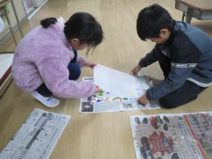 3年生が図工の授業で、カラー紙版画づくりを行いました。テーマは、「へび年をおいわいしよう!」。今日が仕上げの日となり、仲間と協力し合って慎重に紙に刷っていました。子どもたちは、出来栄えにとても満足気でした!