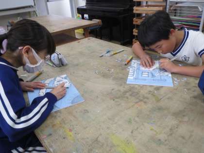 4年生が、図工の授業で木版画づくりに取り組んでいます。下絵を板に丁寧に書き終えて、いよいよ彫刻刀で彫り始めました。無言で彫り続けているときの目は真剣そのものでした。