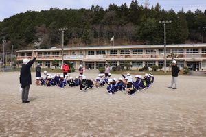 写真下:校長からは、何が起きているのか、どこが危険なのか、どう避難したらよいかまずは放送や指示を「聞く」ことを大切にしましょうと話をしました。