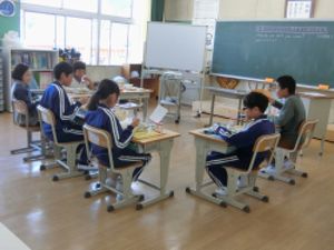 写真下:給食の時間です。(メニューがたけのこご飯だったからでしょうか)今日の給食中の話題は「きのこの山」か「たけのこの里」か論議です。「きのこの山はこまにもなる」との意見もありましたが、たけのこの里に1票。