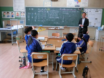 写真上:算数の「わり算」の学習です。今日は12個のイチゴを3個ずつ分けます。昨日と同じ「12÷3」ですが、わる数が何を表しているのか考えます。計算の仕方だけでなく、式が表す意味も丁寧に学習していきます。