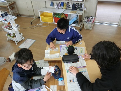道徳「命のアサガオ」の授業です。「問い」を作るために個々に資料を読み込み、疑問に思ったことを付箋にどんどん書いていきます。その後、グループで共有しあい、話し合いたい問いを3つに絞っていきます。時間いっぱい取り組む姿に、意欲の高さがうかがわれます。