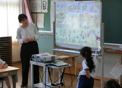 道徳「なにをしてしているのかな」の学習です。運動場で遊んでいる様子の絵を見て、よい行いとよくない行いを見付け、その理由を発表しています。