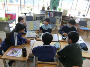 写真下:総合的な学習の時間で、「敷島っ子アドベンチャー」について話し合っています。まだ公表できませんが、計画している6年生がとっても楽しそうなので、1〜5年生のみなさんも、楽しみに待っていてください。