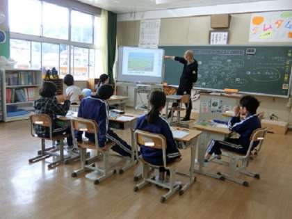 写真上:社会科の授業です。国土の地形の特徴について話し合い、学習課題を作ります。庄内平野の写真を見ながら、気付いたことを話し合っています。「川がある」「海が見えるから、土地は低いと思う」どんな学習課題ができるでしょうか。