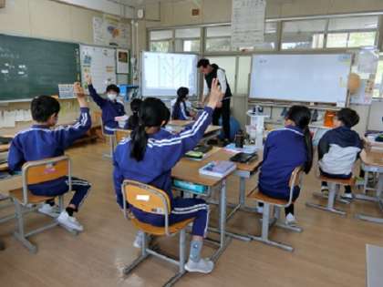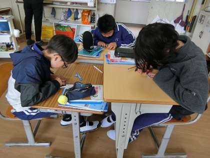 写真上:算数科「対称な図形」の学習です。線対称について、確かめ合っています。「線対称とは?」「全部重なる」「対称の軸で折ると、ぴったり重なる」「対応する点を結ぶ線は対称の軸と垂直」友達の意見に付け足して、みんなで学びを深めていました。